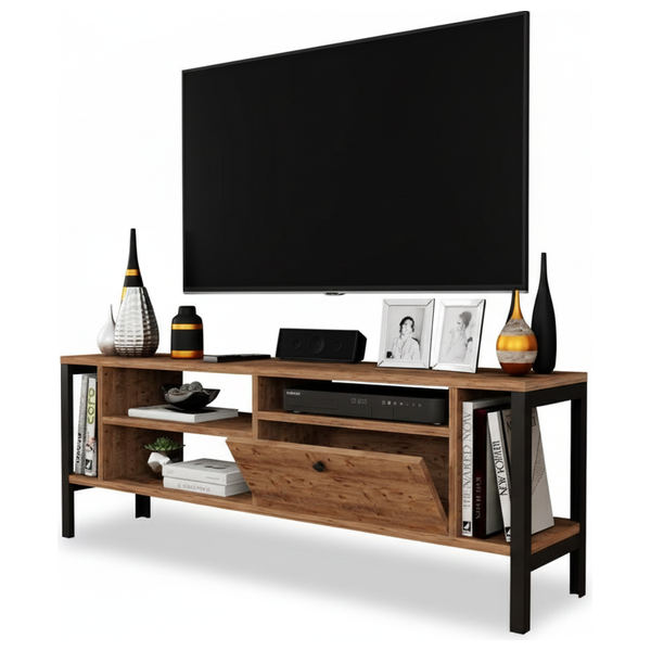 طاولة تلفاز خشبية من فرست شاين بتصميم أنيق وعصري. مصممة لتلفازات من 42 إلى 55 بوصة وتبلغ أبعادها 140×50×30 سم (عرض × ارتفاع × عمق). تتضمن رفوف مفتوحة لأجهزة الوسائط وادراج لتخزين الريموت والكابلات، مما يساعد في ترتيب الأسلاك والحفاظ على ترتيب الغرفة.