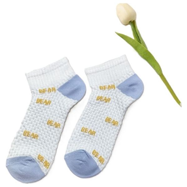 جوارب مصنوعة من خامة قطنية ناعمة ممزوجة لراحة طوال اليوم، مع نسيج شبكي بتصميم خلايا العسل لتهوية وتقليل التعرّق، ونقشة “BEAR” منسوجة بشكل متكرر لمظهر لطيف. الكعب والأصابع باللون الأزرق السماوي معزّزة لتحمّل أفضل، مزودة بـسوستة مطاط مرن تمنع الانزلاق وتحافظ على الثبات