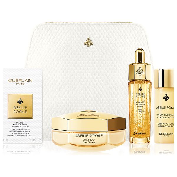 مجموعة العناية بالبشرة تحتوي على: لوشن مقوي بغذاء ملكات النحل بحجم 40 مل. زيت المائي للشباب المتطور بحجم 15 مل. سيروم دبل آر المتقدم للتجديد والإصلاح بحجم 7*0.6 مل. كريم النهاري ابيلي رويال بحجم 50 مل. حقيبة صغيرة.