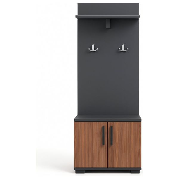 يتميز بلوحة خلفية عالية مع رف علوي وعلّاقين معدنيين للمعاطف وخزانة أسفل بواجهات خشبية لتخزين مخفي.تناسب مع المساحات المعاصرة مع الحفاظ على تنظيم الأغراض والوصول إليها بسهولة