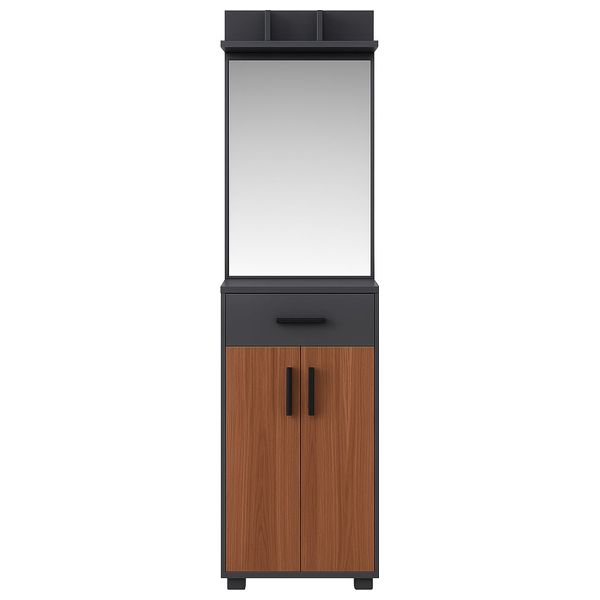 يقدّم حلاً أنيقاً وعملياً للمدخل، حيث يدمج مرآة وبنية تخزين متعددة. يتضمن هذا الوحدة رفاً علويّاً بثلاثة أقسام، ومرآة واسعة، ودرجاً ضئيلاً وبابين مع لوحات خشبية لتخزين المعاطف والإكسسوارات