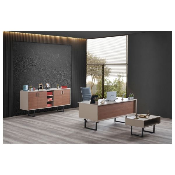 تصميمًا عصريًا وعمليًا لمساحات العمل في المنزل أو المكتب. يتميز الإطار والمتانة العالية لمكونات الطقم، مع أسطح واسعة لترتيب اللابتوب، المستندات، والأدوات المكتبية