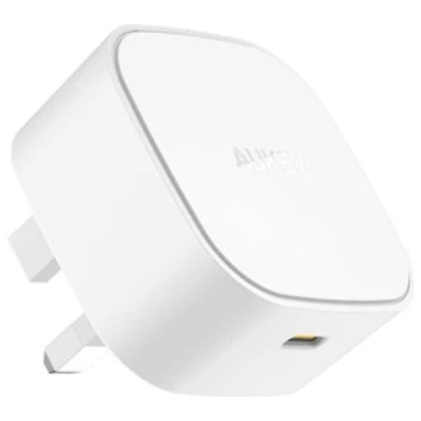 شاحن جداري أبيض مدمج من Aukey Minima بقوة 20W PD مع منفذ USB-C لشحن سريع. مثالي لهواتف iPhone 12 وما بعدها ونينتندو سويتش، واستخدام يومي موثوق بتصميم صغير ومحمول .