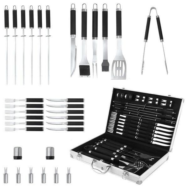 مجموعة ملحقات الشواء الكاملة - ملعقة مسطحة، شوكة، ملقط، فرشاة دهن، فرشاة شواء، سكين، 2 قطعة من الملح و فلفل، 6 قطع من حاملات الذرة، 6 قطع من أسياخ، 6 قطع من سكين شريحة لحم، 6 قطع من شوك شريحة لحم، حقيبة من الألومنيوم
