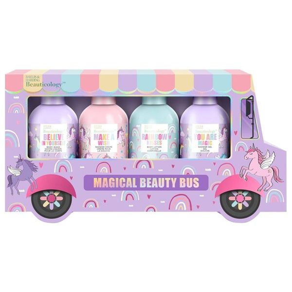 حافلة الجمال السحرية المطلقة تجمع بين أجواء الحفلات مع بريق قوس قزح والباستيل الجميل ووحيد القرن السحري، تمزج بين الروائح المستوحاة من متجر الحلويات من حلوى يونيكورن ونجمة الفراولة وصقيع النعناع لإنشاء مجموعة ممتعة وجذابة، تتكون من غسول الجسم 100 مل، كريم الاستحمام 100 مل، جل الاستحمام 100 مل، لوشن الجسم 100 مل.