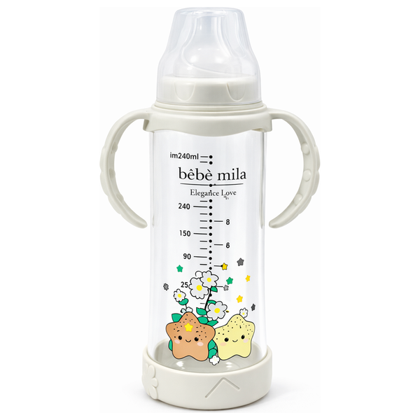 رضاعة بيبي ميلا الزجاجية "إليجانس لاف" بسعة ٢٤٠ مل مصممة خصيصاً لتناسب مراحل نمو طفلك. مصنوعة من زجاج طبيعي نقي وعالي الجودة لا يمتص الروائح أو النكهات، مما يحافظ على طعم ولون الحليب الطبيعي. تأتي الرضاعة بمقبضين جانبيين لمساعدة الطفل على تعلم الرضاعة المستقلة، مع مقياس مدرج وواضح بالمليمتر لتحضير كمية الحليب بدقة. يتميز تصميمها الجذاب برسمة فيل نائم فوق القمر والنجوم لتهدئة الطفل. الرضاعة خالية تماماً من مادة البيسفينول (BPA) ولا تفرز أي مواد ضارة عند التسخين، كما أنها مقاومة عالية للحرارة مما يتيح تعقيمها وتنظيفها بشكل كامل وآمن.