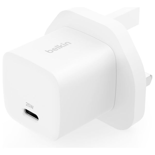 شاحن الحائط Belkin BoostCharge 25W USB-C يوفر شحنًا سريعًا وآمنًا مع دعم PD 3.0 مع PPS. يضم منفذ USB-C واحد، ونظام الحماية Belkin SmartProtect المكون من 6 نقاط، وتصميمًا مدمجًا وخفيف الوزن. متوافق مع أجهزة آيفون وسامسونج وجوجل بكسل وآيباد ونينتندو سويتش وغيرها، ومصنوع من مواد معاد تدويرها ومعبأ في عبوة خالية من البلاستيك.