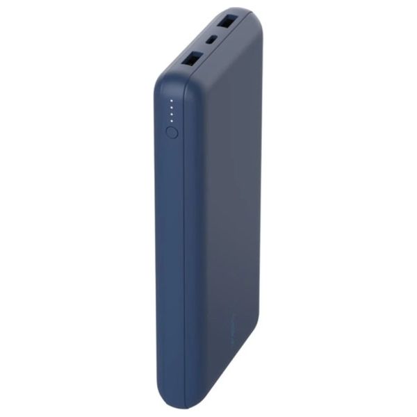 بطارية باور بانك Belkin BoostCharge بسعة 20,000 مللي أمبير – اللون أزرق، تشمل منفذ USB-C بقوة 15 واط ومنفذين USB-A، مع كابل USB-A إلى USB-C بطول 15 سم.