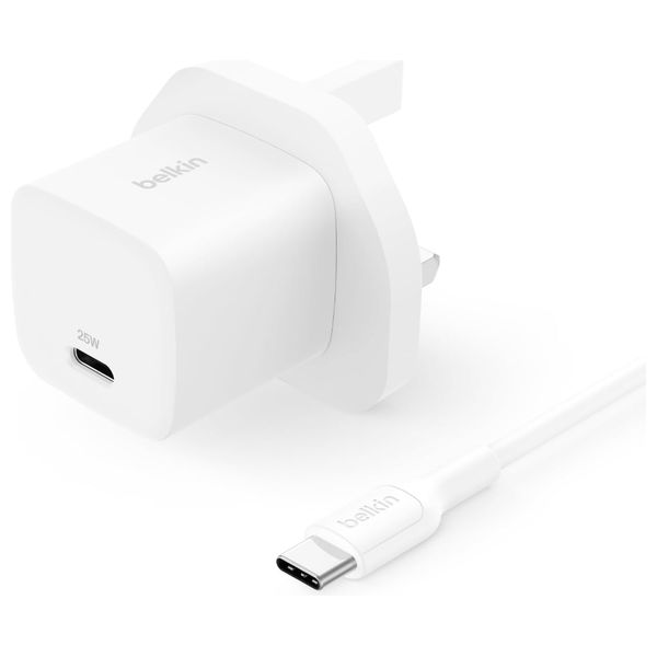 شاحن جداري Belkin بسعة 25W ومنفذ USB-C مع PPS وPower Delivery 3.0 يوفر شحنًا سريعًا وآمنًا للأجهزة المتوافقة. يتضمن الكابل USB-C إلى USB-C بطول 1 م ليمنحك حلاً شحنًا متكاملاً للهواتف والأجهزة اللوحية وغيرها من الأجهزة التي تدعم USB-C. تصميمه المدمج مع حماية من زيادة الجهد والتيار يجعل استخدامه مثاليًا في المنزل والعمل والسفر.