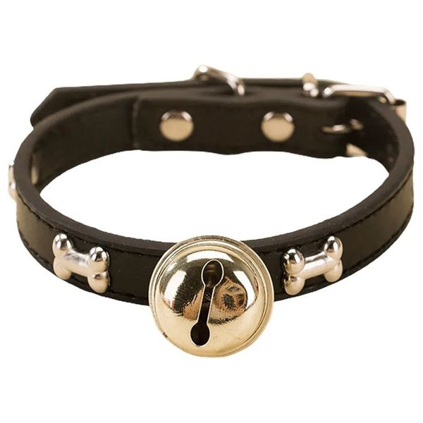 طوق قطط جلدي أنيق قابل للتعديل، مزود بجرس ذهبي ومسامير معدنية على شكل عظام لإطلالة مميزة، يوفر إغلاقًا آمنًا بمشبك معدني متين