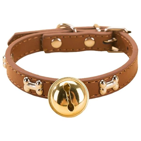 طوق قطط جلدي أنيق قابل للتعديل، مزود بجرس ذهبي ومسامير معدنية على شكل عظام لإطلالة مميزة، يوفر إغلاقًا آمنًا بمشبك معدني متين