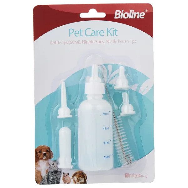 مجموعة رضاعة كاملة مصممة للجراء والقطط حديثة الولادة والحيوانات الصغيرة. تضم زجاجة رضاعة سعة 60 مل مع علامات قياس واضحة، وخمس حلمات ناعمة الملمس وفرشاة تنظيف الزجاجة للمحافظة على النظافة. المكونات المتينة آمنة للحيوانات وتضمن تدفق حليب موثوق