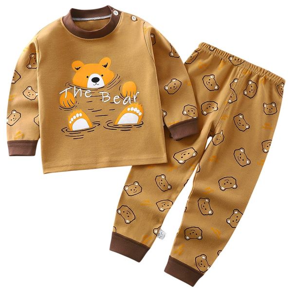 طقم بيجاما مريح للأطفال بتصميم دب بني لطيف. يتألف من بلوزة بأكمام طويلة وبنطال مطابق بنقشة دب متكررة. مصنوع من مزيج قطني ناعم، يوفر دفئًا مريحًا وسهولة في العناية