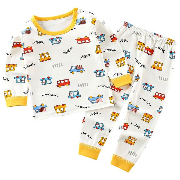 طقم بيجامة قطني للأولاد يتميز بخلفية بيضاء مع طبعات مركبات ملونة مع حواف صفراء عند الأكمام. مصنوع من قطن مريح وسهل العناية به لراحة النوم