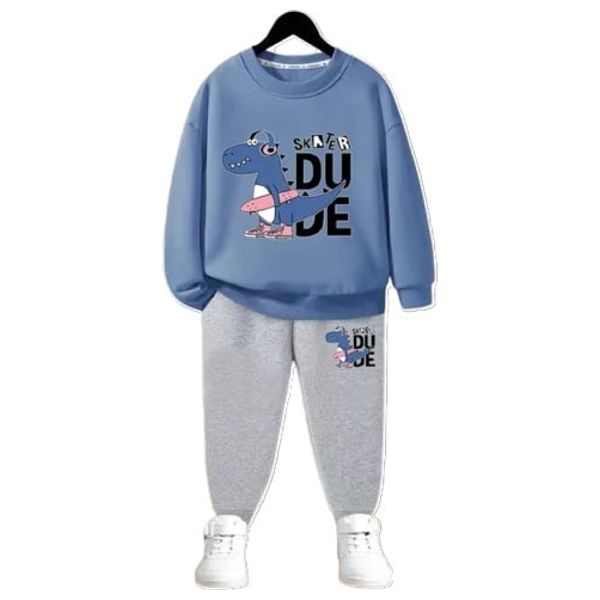 طقم ملابس بنات مكون من سويت شيرت أزرق بطبعة ديناصور وجوجرز رمادية اللون. يجمع التصميم بين المظهر الكاجوال والراحة للاستخدام اليومي