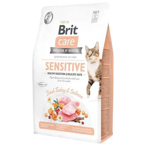 طعام جاف مضاد للحساسية للقطط البالغة الحساسة هضميًا أو ذات تفضيلات طعم رقيقة. يحتوي على ديك رومي طازج وسلمون لتوفير بروتين عالي الجودة وسهل الهضم، مع الحفاظ على نكهة ممتازة. غني بجذر الهندباء الطبيعي لدعم صحة الأمعاء وامتصاص العناصر الغذائية، ويحتوي على فيتامينات، معادن، وتورين لتعزيز المناعة وصحة القلب والعين. أحماض أوميغا 3 و6 الدهنية من زيت السلمون تعزز صحة البشرة وفراء لامع. خالٍ من الكائنات المعدلة وراثيًا، الصويا، والملونات الصناعية