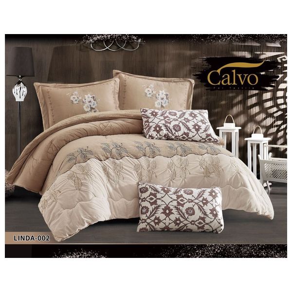 طقم لحاف شتوي فاخر مكوّن من 7 قطع، يضم لحاف قطيفة فرو مقاس 240×260 سم، وشرشف مطاطي (لاستيك) 200×200×30 سم، ووجهَي مخدة 5+50×75 سم، ووجهَي مخدة 50×75 سم، بالإضافة إلى كوشة أنيقة مقاس 45×45 سم