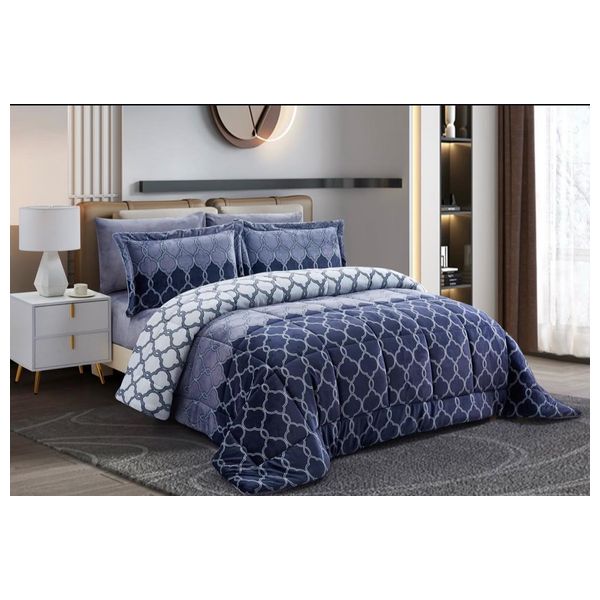 طقم لحاف مكوّن من 4 قطع من قماش الفلانيل المطبوع، يشمل لحاف بحجم 180×240 سم، شرشف مفروش بقياس 120×200 سم بعمق 33 سم، غطاء وسادة 50×75 سم، وغطاء وسادة زخرفي (شميس) 50×75+5 سم