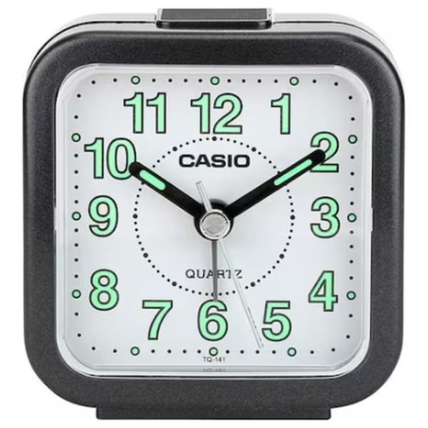 ساعة كاسيو TQ-141-1DF تماثلية صغيرة الحجم على الطاولة، تتميز وجهاً واضحاً وأرقاماً مضيئة لقراءة سهلة من مسافة. إطار أسود وواجهة بيضاء يمنحان مظهراً بسيطاً وخلّاقاً، مناسب لغرف المعيشة والنوم والاستقبال والمكاتب. تعمل بالحركة الكوارتز لضبط الوقت بدقة.