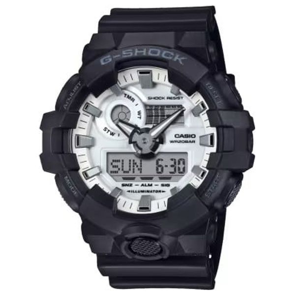ساعة يد متينة من طراز جي-شوك، مصممة للارتداء اليومي والأنشطة الخارجية. هيكلها وإطارها مصنوعان من الراتنج، مع سوار راتنجي، ومحميان بزجاج معدني. تتميز الساعة بمقاومة الصدمات ومقاومة للماء حتى عمق 200 متر، مما يجعلها مناسبة للسباحة والغطس. أبعاد هيكلها 57.5 × 53.4 × 18.5 ملم، ووزنها 72 غرامًا. تعمل ببطارية CR2016 تدوم لخمس سنوات تقريبًا. السوار قابل للتعديل ليناسب مقاسات المعصم من 145 إلى 215 ملم.