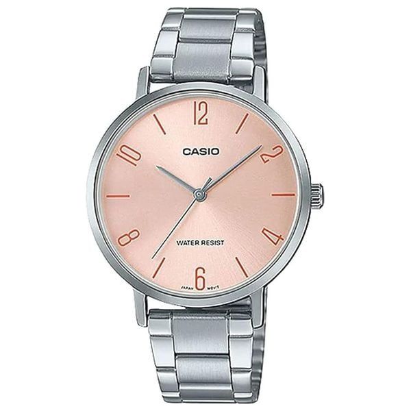 ساعة كاسيو أنالوج بتصميم أنيق بلون زهري ناعم، سوار من الستانلس ستيل وإطار من الراتنج، مقاومة للماء حتى عمق 30 متر، مناسبة للاستخدام اليومي مع عرض منتظم للوقت ودقة عالية في الأداء.