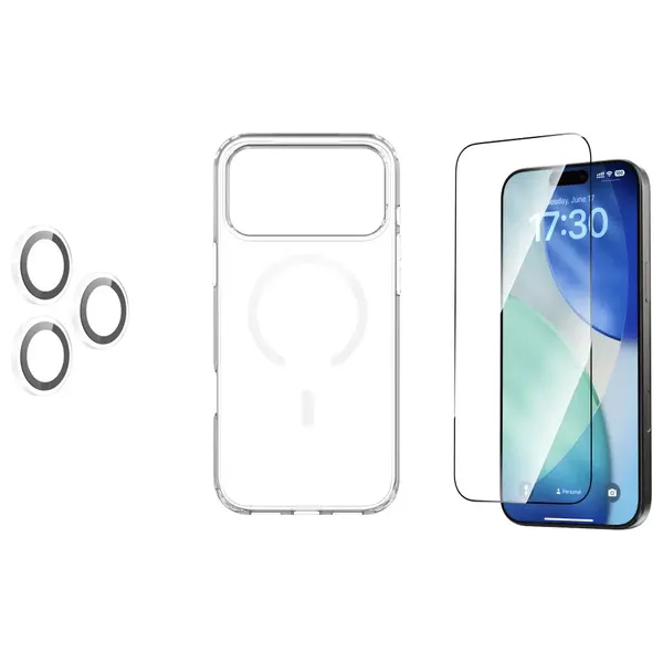 حزمة حماية ستار سيريز 3 في 1 من ديفيا لهاتف ايفون 17 برو ماكس، تتميز بحافظة شفافة وحماية للشاشة لحماية الجهاز من الخدوش والصدمات البسيطة. توفر ملاءمة دقيقة مع وصول سهل إلى المنافذ والأزرار، وتحافظ على التصميم الأصلي مع حماية يومية موثوقة.