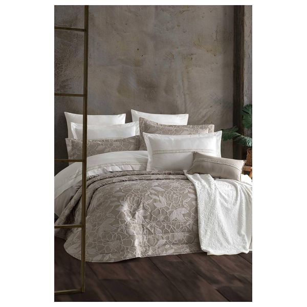 طقم مفارش نوم مع تطريز زهرى أنيق على قاعدة بنية داكنة. يشمل طقم الفرش: غطائان لحاف 260×240 سم و220×200 سم، جرّاف دوشك 260×270 سم، ست أغطية مخدات 50×70 سم، بطانية وكوشة