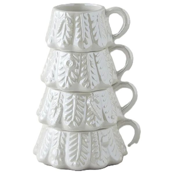 طقم أكواب من السيراميك الأبيض مكوّن من أربع قطع، يتميز بنقش نباتي بارز. كل كوب بقبض مريح وبناء متين، مثالي لتقديم الشاي أو القهوة