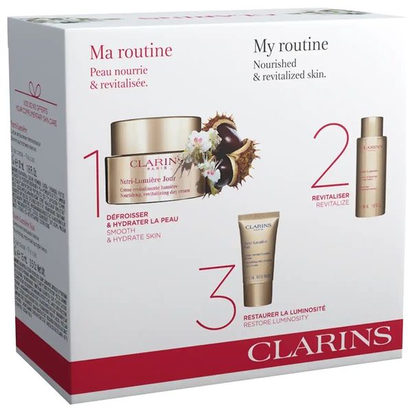 مجموعة مثالية لتغذية البشرة بشكل مكثف، وتنشيطها واستعادة اشراقها, تحتوي على كريم نوتري لوميير النهاري لجميع أنواع البشرة بحجم 50 مل, كريم نوتري لوميير الليلي لجميع أنواع البشرة بحجم 15 مل, لوشن نوتري لوميير لتجديد شباب البشرة بحجم 50 مل.