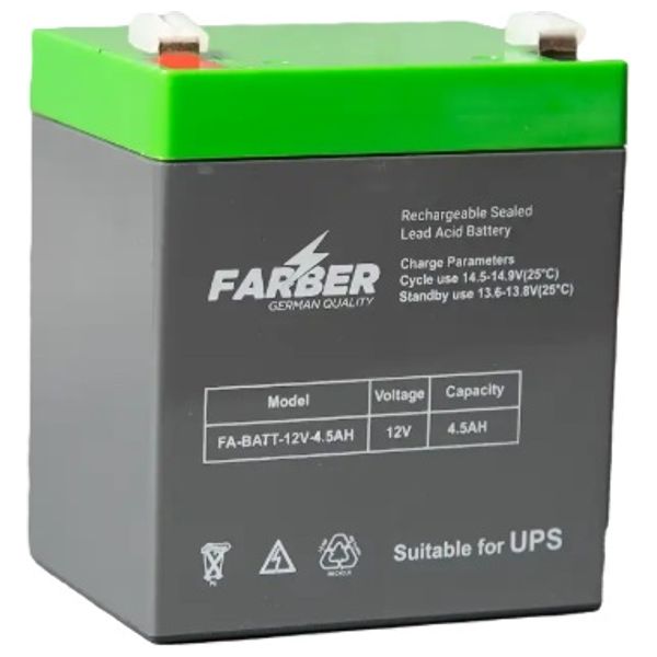بطارية FARBER بسعة 12V / 4.5AH مصممة لتوفير طاقة احتياطية مستقرة للأجهزة المتوافقة مع بطاريات SLA، مثل أجهزة UPS، لضمان تشغيل مستمر عند انقطاع الكهرباء.