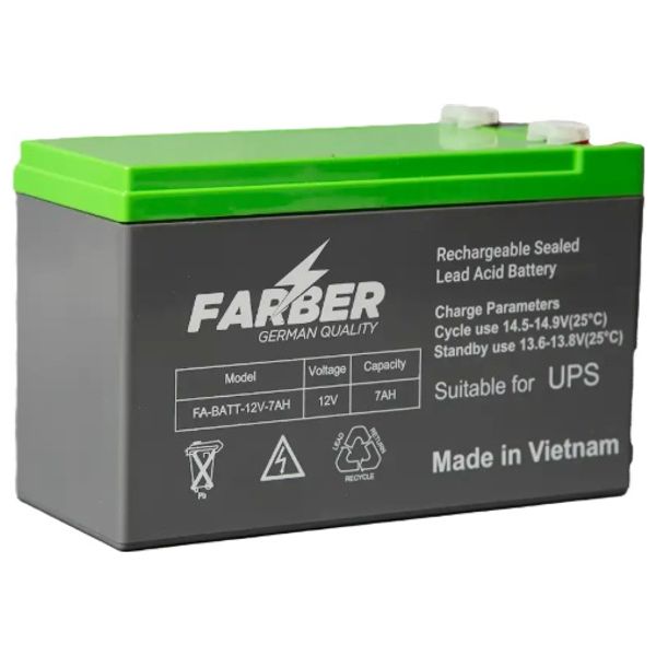 بطارية FARBER بسعة 12V / 7AH مصممة لتوفير طاقة احتياطية للأجهزة المتوافقة مع بطاريات SLA، تضمن تشغيل مستمر ومستقر عند انقطاع الكهرباء.