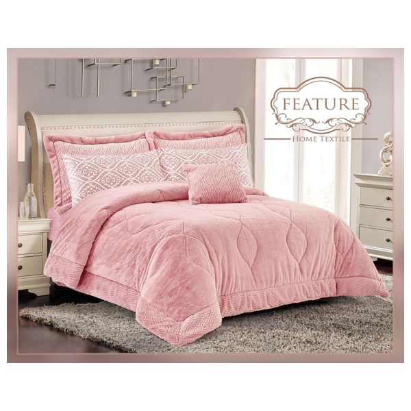 مجموعة لحاف شتوية مكونة من 7 قطع: لحاف قطيفة (230×250 سم)، شرشف لاستيك (200×200×30 سم)، 2 وجه مخدة (5+50×75 سم)، 2 وجه مخدة (50×70 سم)، وكوشة (45×45 سم)