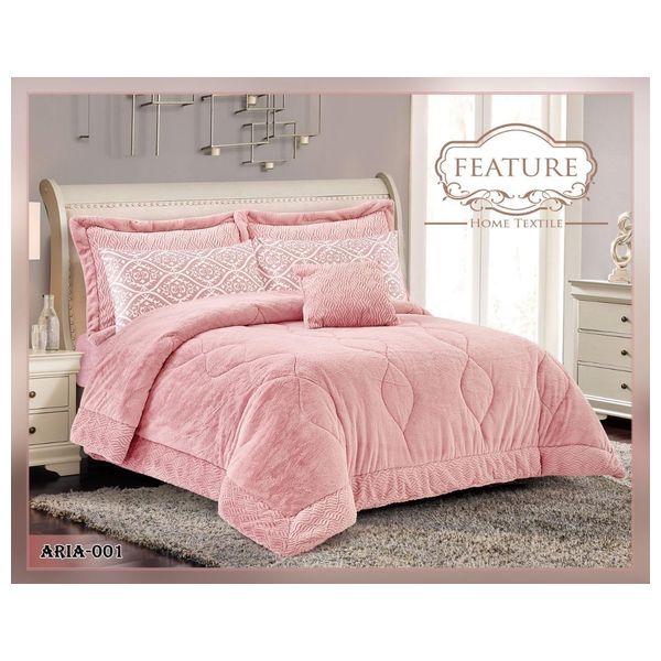 طقم لحاف شتوي فاخر مكوّن من 7 قطع، يضم لحاف قطيفة مقاس 230×250 سم، وشرشف مطاطي (لاستيك) 200×200×30 سم، ووجهَي مخدة 5+50×75 سم، ووجهَي مخدة 50×70 سم، مع كوشة أنيقة مقاس 45×45 سم