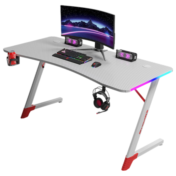 طاولة الألعاب D2209 RGB تأتي بتصميم أنيق مع سطح كربون فايبر متين، مزودة بإضاءة RGB قابلة للتحكم عن بُعد، وحامل سماعة رأس وحامل كوب لراحة وتنظيم مثاليين أثناء اللعب. الأبعاد: 75 × 140 × 60 سم.