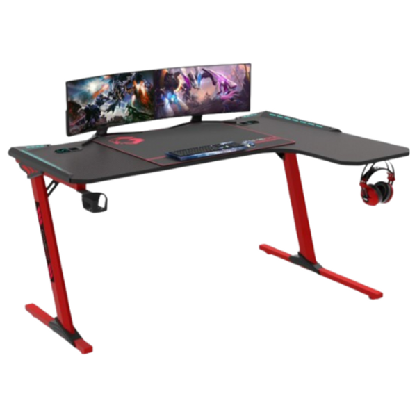 طاولة ألعاب T418-L بتصميم أنيق على شكل L وسطح كربون فايبر مقاوم للخدوش، مزودة بإضاءة RGB قابلة للتحكم عن بُعد، وحامل سماعة رأس وحامل كوب لراحة إضافية. الأبعاد: 75 × 160 × 60 سم، مثالية لأجهزة الألعاب والتجميعات المتعددة.