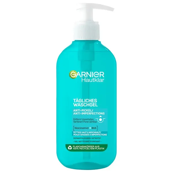 جل غسول Hautklar من غارنييه منظف يومي مطهر للبشرة الدهنية والمعرضة للبثور. يحتوي على نياسيناميد وBHA للمساعدة في إزالة الشوائب وتنظيف المسام وتقليل اللمعان. العبوة 200 مل