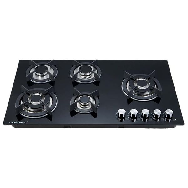 طباخ غاز زجاجي مدمج من ماركة جوسونيك، بخمس شعلات وبحجم 90 سم، يعمل ببطارية 1.5 فولت، مزوّد بدعامة حوض من الحديد، يحتوي على شعلتين بقطر 130 ملم، وشعلتين بقطر 75 ملم، وشعلة واحدة بقطر 55 ملم.