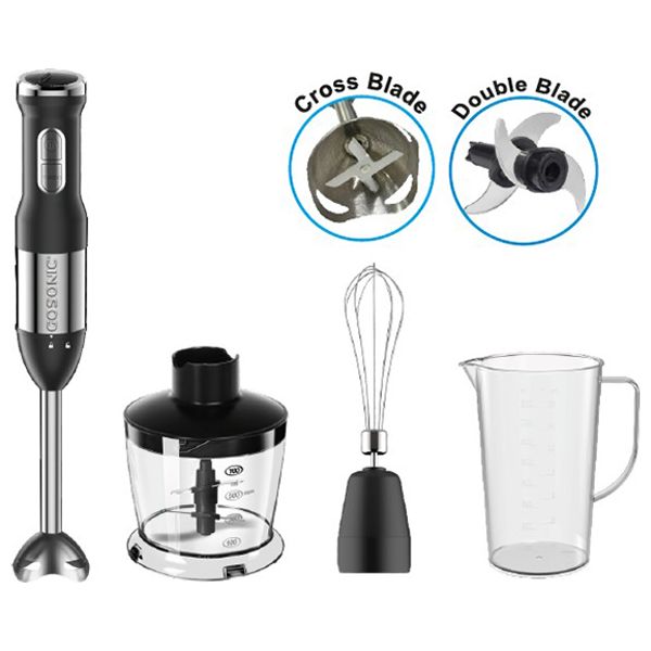 خلاط يدوي متعدد المهام من ماركة جوسونيك، بمحرك DC قوي بقدرة 1200 واط، مزوّد بمفرمة بسعة 700 مل مع شفرات مزدوجة، وكوب بسعة 800 مل مع مقبض وفتحة سكب وخفّاقة، محرك نحاس 100%، تحكم متغير بالسرعة مع وضعيّــة عادية وتيربو، تشطيبات فاخرة بطلاء كروم، هيكل من الستانلس ستيل SUS304، وشفرات رباعية الأوراق SUS301.