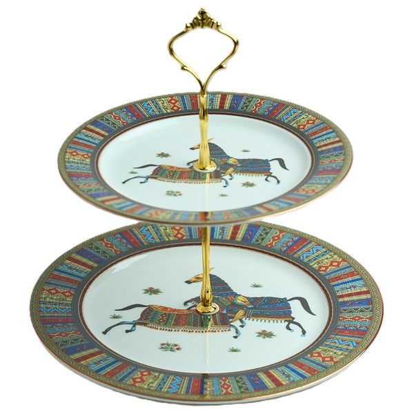 طقم تقديم فاخر من طبقتين مصنوع من بورسلان عالي الجودة، مزين بنقشة الحصان الملكية وطلاء ذهبي أنيق. يوفّر التصميم طبقتين للتقديم، قاعدة مستقرة، ومقبض معدني لامع للحمل بسهولة، ليضيف لمسة فخامة كلاسيكية وعصرية على طاولة الضيافة