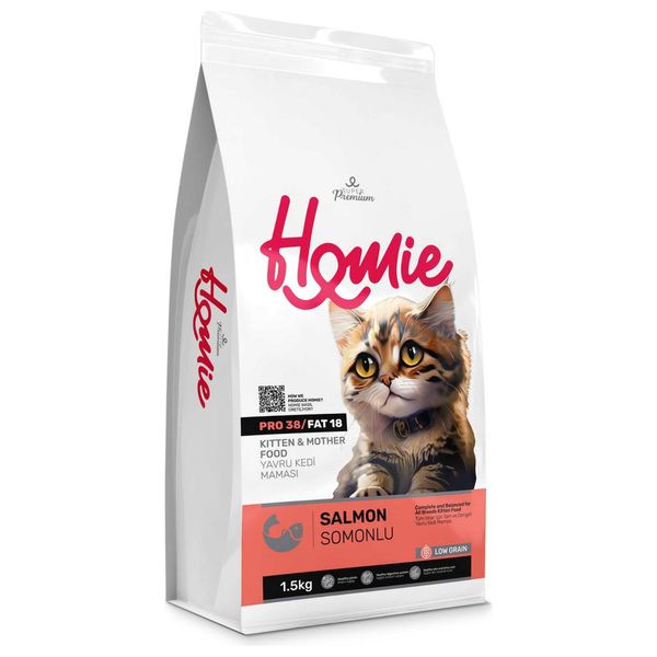 هومي كيتن آند ماذر بنكهة سمك السلمون هو طعام قطط فائق الجودة وقليل الحبوب، مصمم خصيصاً لتلبية الاحتياجات الغذائية العالية للقطط الصغيرة في مرحلة النمو والأمهات المرضعات. بفضل تركيبته الغنية بالبروتين (38%) والدهون (18%)، يدعم هذا الطعام النمو الصحي السريع ويوفر الطاقة اللازمة لتعافي الأمهات. تركيبة سمك السلمون غنية بأحماض أوميغا الدهنية التي تعزز صحة المفاصل، وتحسن عملية الهضم، وتمنح قطتك بشرة صحية وفراءً متألقاً. يوفر هذا النظام الغذائي المتوازن جميع الفيتامينات والمعادن الأساسية لحياة صحية.
