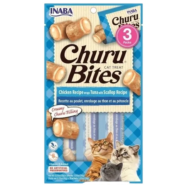 وجبات قطط طرية على شكل وسادة، تجمع بين حشوة تشورو كريمية وطبقة خارجية ناعمة من تونة مع سكالوب. مصنوعة من دجاج وتونة حقيقية، خالية من الحبوب والمواد الحافظة والألوان الصناعية، وتحتوي على فيتامين E وخلاصة الشاي الأخضر لدعم صحة القطط