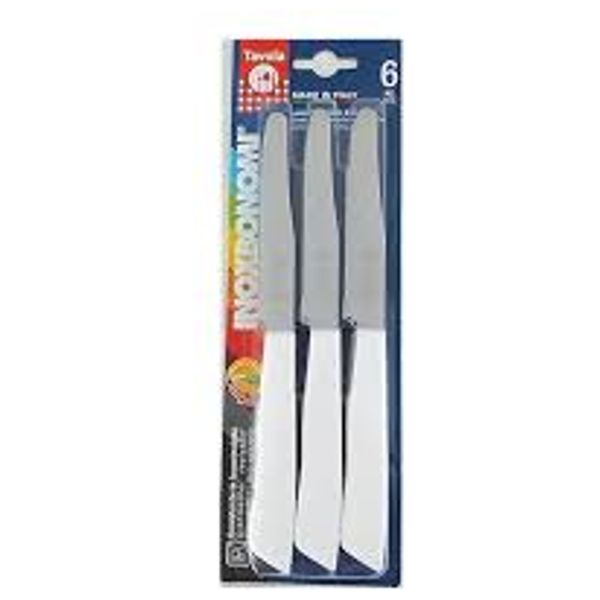 هذا الطقم المكوّن من 6 سكاكين مائدة يحتوي على شفرات فولاذية مقاومة للصدأ بطول 11 سم مع سن 1/4. المقبض الأبيض المريح يتيح قبضة مريحة، وتوفر الشفرات متانة مناسبة للاستخدام اليومي. صنع في إيطاليا.