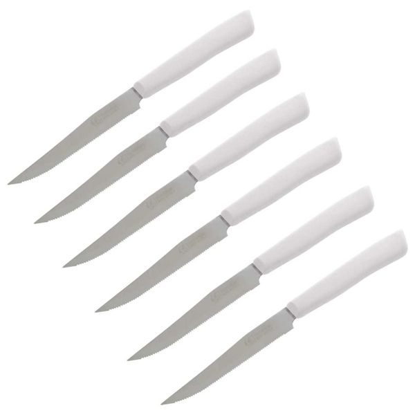 طقم سكاكين شريحة اللحم من إينوكس بونومي رقم الموديل 32006BSC يضم ست قطع بنصل من الفولاذ المقاوم للصدأ بطول 11 سم وسمك 0.8 مم، مع مقابض من PP باللون الأبيض توفر قبضة مريحة وأداء قطع متين في المطبخ.