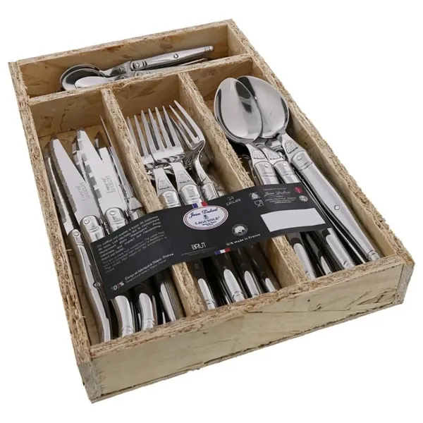 ارفع مائدتك مع مجموعة جان دوبوست 24 قطعة BRUT رينج في صينية OSB، تتكون من 6 سكاكين (1.2 مم)، 6 شوكات (1.5 مم)، 6 ملاعق (1.5 مم)، و6 ملاعق شاي (1.2 مم). تتميز بتصميم ليغويل الحديث ومتانة الفولاذ المقاوم للصدأ للاستخدام اليومي والمناسبات.