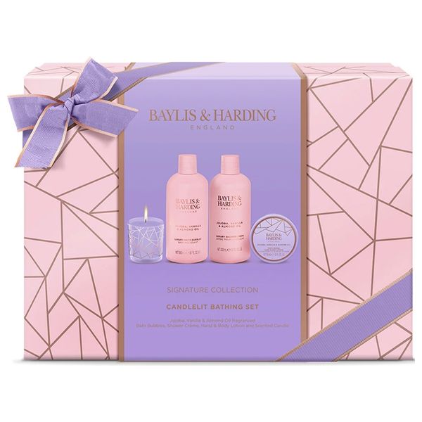 صندوق هدايا تذكاري كبير مثير للإعجاب لتجربة استحمام مثالية, معطر بمزيج أنثوي من الجوجوبا والفانيليا وزيت اللوز الحلو, يحتوي على فقاعات استحمام 300 مل وكريم استحمام 300 مل لتنظيف البشرة وتعطيرها بلطف, لوشن اليد والجسم 50 مل, شمعة معطرة 60 غرام تساعد على إضفاء أجواء هادئة على الحمام.