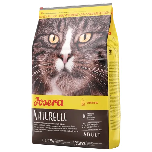 غذاء قطط جاف خالٍ من الحبوب مصمم للقطط البالغة المعقمة. يجمع العدس والسلمون المرقط ليقدم وجبة لذيذة مع محتوى دهون معتدل. يشتمل على وقاية من تكون الجير من خلال ربط الكالسيوم في اللعاب للمساعدة في تقليل تكون الجير، ويحافظ على صحة البول بوجود قيمة pH بين 6.0 و6.5. هذا النظام الغذائي الكامل خالٍ من الغلوتين، ولا يحتوي على القمح وفول الصويا والمكونات المعدلة وراثياً، ولا النكهات الاصطناعية والألوان والمواد الحافظة والألبان والسكر. يُنتَج بشكل مستدام ومحايد للكربون بمكوّنات معتمدة من DLG لتحسين الهضم وتقليل كميات التغذية