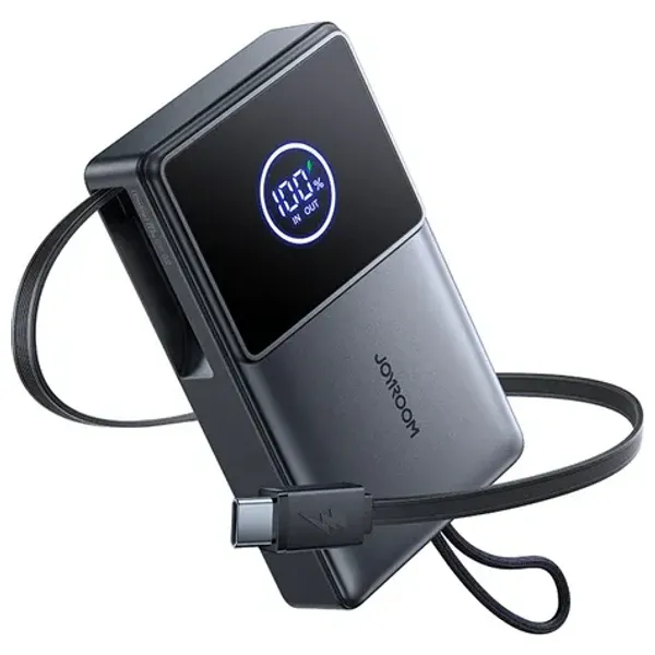 بنك طاقة جويروم JR-PR1 بسعة 10000mAh وشحن حتى 22.5 واط، يتميز بكابل Type-C مدمج قابل للسحب يصل طولها إلى 70 سم وشاشة LED تعرض نسبة الشحن وحالة الشحن. الغلاف من PC+ABS مقاوم للحريق وخفيف الوزن حوالي 200 غرام، مما يجعله خياراً عملياً للحمل والاستخدام اليومي، ويدعم شحن عدة أجهزة في آن واحد. مناسب للاستخدام .