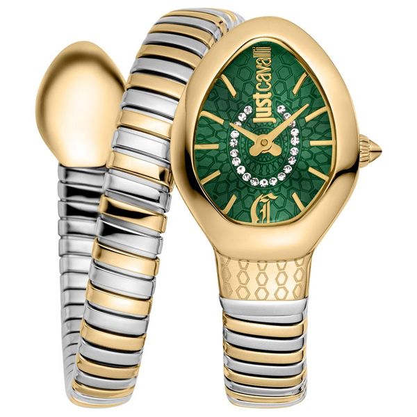 ساعة جست كافالي النسائية ثنائية اللون، تتميز بعلبة بيضاوية من الفولاذ المقاوم للصدأ بلون ذهبي وسوار بلونين. ميناءها الأخضر مرصّع بالكريستال، وتعمل بحركة كوارتز تناظرية. محمية بزجاج معدني، وتوفر مقاومة للماء حتى عمق 3 أمتار. بعلبة صغيرة بقطر 22 مم، وعرض سوار 10 مم، ووزن 45 غرام