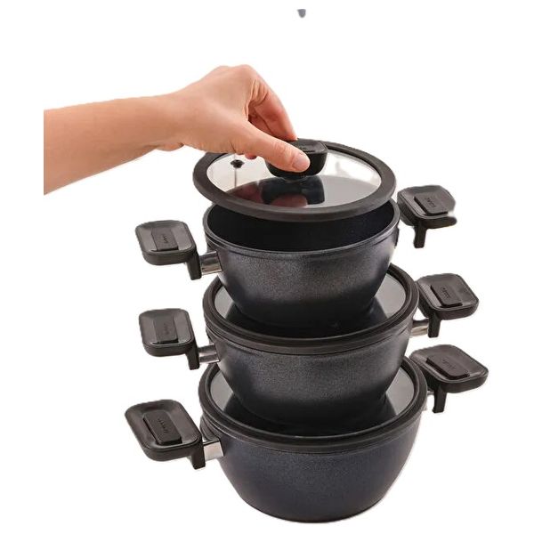 طقم قدور مصنوع بتقنية طلاء الماس الفائق التحمل المعزز بـ300,000 بلورة ماس حقيقية، لضمان مقاومة فائقة للخدش وطهي صحي ولذيذ، يتميز بتوزيع حرارة متساوٍ بفضل طبقة الألمنيوم عالية التوصيل، وسطح داخلي وخارجي سهل التنظيف وآمن لغسالة الأطباق، يشمل: قدر 16 سم، قدر 18 سم، وقدر 20 سم