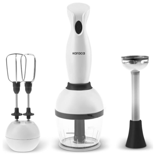 مجموعة خلاط كاراكا برو ميدي 3 قطع بقوة 1000 واط، تجمع بين الخفق، الخلط، والتقطيع بسهولة. تشمل ملحقات قابلة للإزالة، شفرات فولاذ مقاوم للصدأ، وعاء تقطيع وذراع خلاط. مثالية لتحضير العصائر، الصلصات، العجائن، وطعام الأطفال. تصميم مقاوم للحرارة يسمح بطهي الشوربات، والتنظيف سهل بفضل الملحقات القابلة للفصل